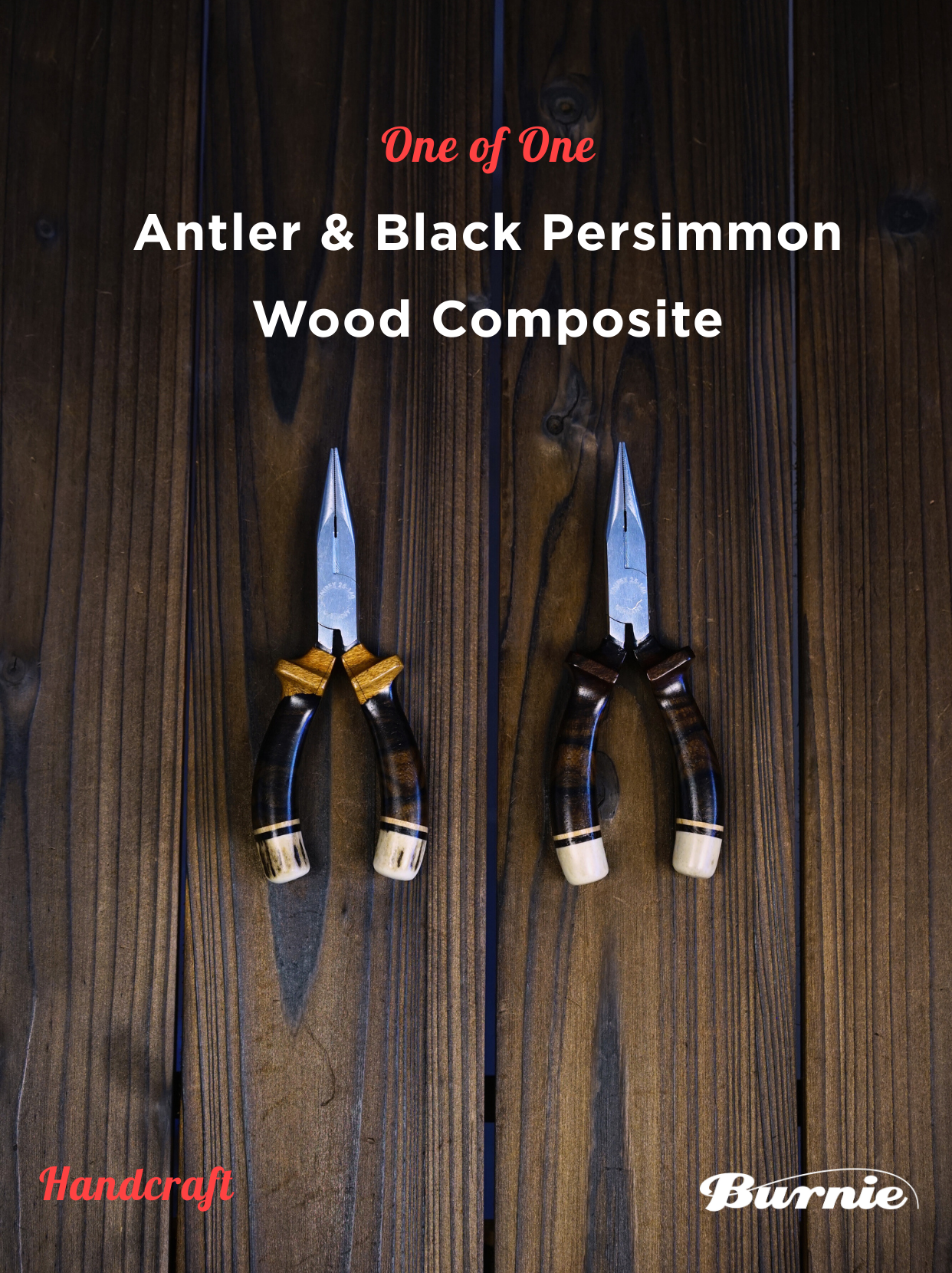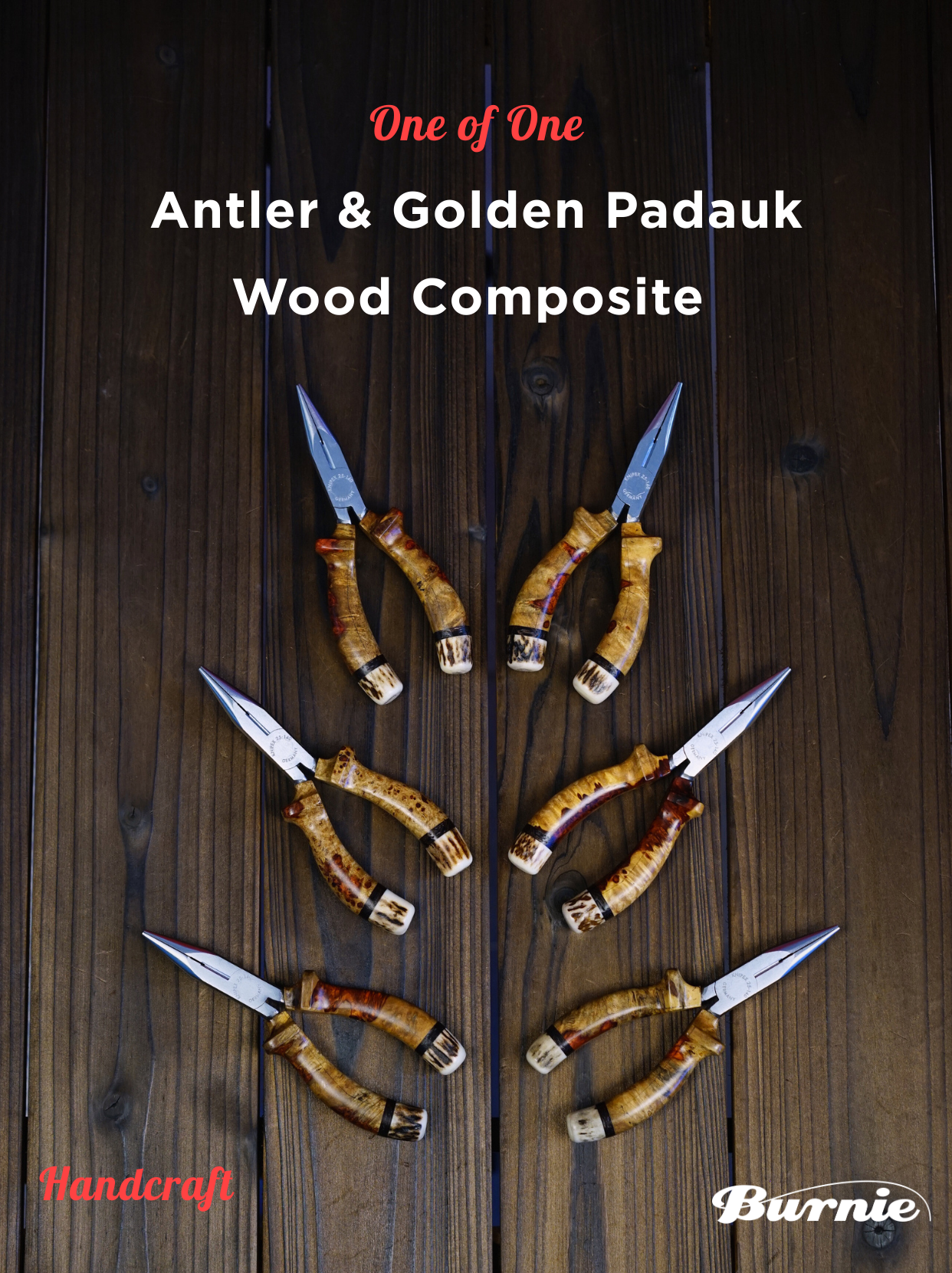 Precision meets nature. Featuring a genuine German KNIPEX pliers head, sustainably sourced solid antler handle, and genuine leather sheath. Available in three exclusive wood inlays: Red Burma Padauk Burl, Golden Burma Padauk Burl, and Black Persimmon Wood.