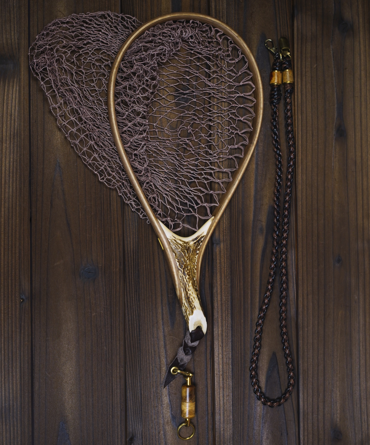 A powerful neodymium magnet holds your net securely through currents and crossings—yet releases instantly with a gentle tug when the fish strikes. Housed in solid Padauk Burl, each release shares the same warmth and figure as the FANTASIA handle it accompanies. The brass split ring—keyring-style, solid, dependable—attaches effortlessly to your gear. The Korean waxed cord lanyard is smooth, strong, and holds its knots through seasons of use.